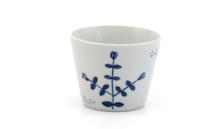 かわいらしいパターン柄や植物柄を、染付で施したフリーカップ&ソーサーのペアセットです。