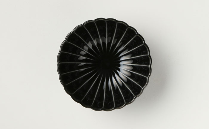 日本古来の藍染の色をやきもので表現したもので、深い藍色と菊型の白いラインがひときわガラスを連想させます。