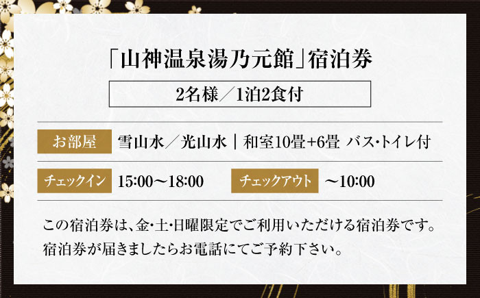 | 容量 | 「山神温泉湯乃元館」宿泊券:2名様/1泊2食付 お部屋:【雪山水・光山水】和室10畳+6畳 バス・トイレ付 チェックイン:15:00~18:00 チェックアウト:~10:00 宿泊券は換金・転売不可 ※ご予約日時は余裕をもってご指定ください。 |
