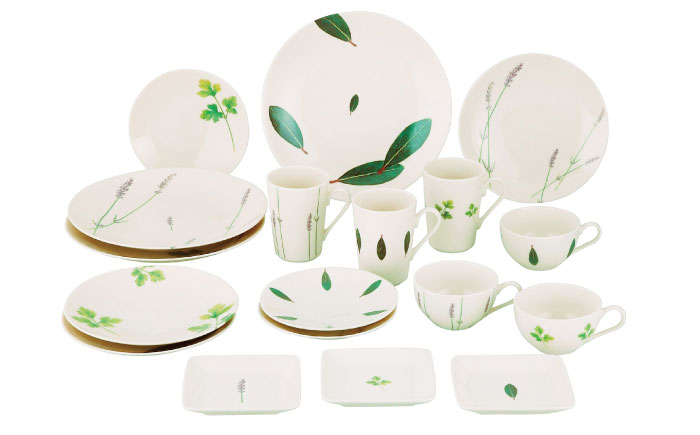 そんなハーブを毎日の食卓で楽しんでほしいから、食器の中に閉じ込めました。ボリュームたっぷりな、6形状×3点・計18点の食器セット。