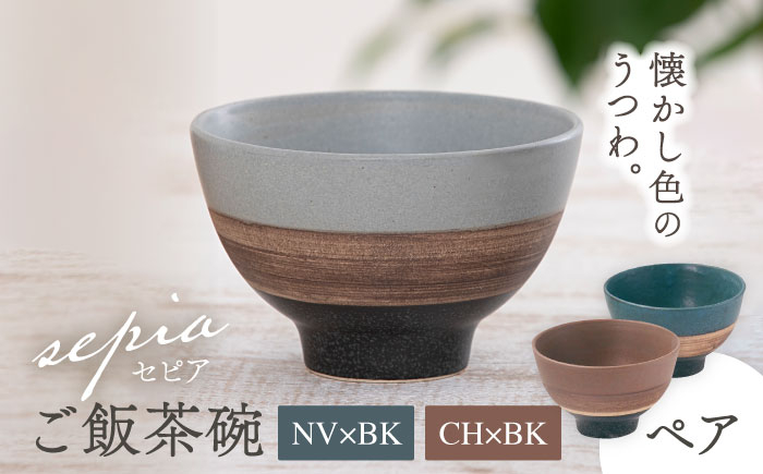 刷毛目の風合いがかっこいい 【美濃焼】sepia-セピア- ご飯茶碗 ペアセット NV×BK(ネイビー)/CH×BK(チャコール)【伸光窯】 [MAQ081]