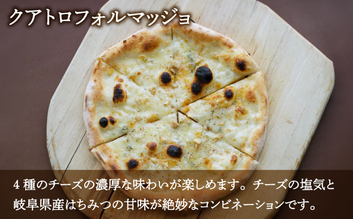 イタリア語で「4種のチーズ」の意味を持つピザ。チーズの濃厚な味わいがたっぷりお楽しみいただけます。チーズの塩気と岐阜県産はちみつの甘味が絶妙なコンビネーションです。