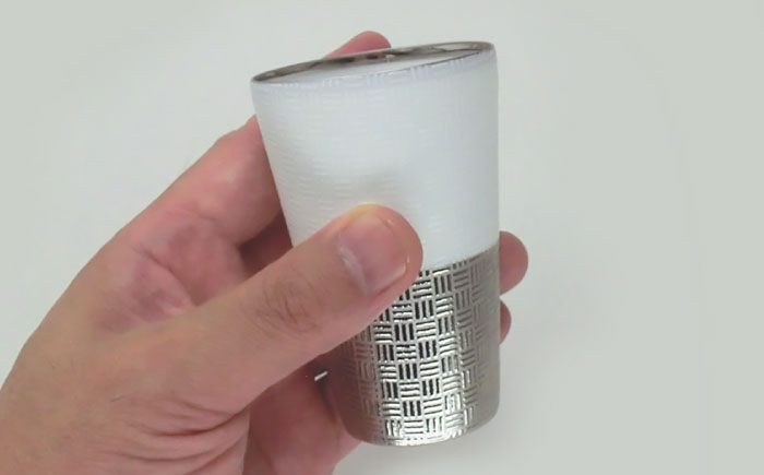 プラチナを使用したうすづくりの冷酒盃 職人の卓越した技術により極限までうすく成形しました。白場と着色部分のコントラストバランス、白場部分にもあえて銅板転写を貼り、淡いエンボス模様を表現している点が商品のこだわりポイントです。