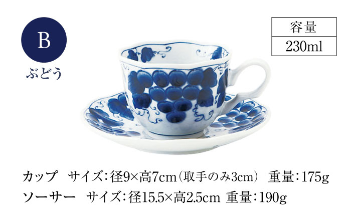 | 容量 | ※5柄からお好きな柄を、最大2柄お選びください。 A:間取桃花 B:ぶどう C:菊唐草 D:染花絵 E:花伊万里 【セット内容】 染付カップ&ソーサ― × 2客 【サイズ】 ■ 染付カップ 径9×高7cm(取手のみ3cm) 重量 175g 容量 230ml ■ 染付ソーサー 径15.5×高2.5cm 重量 190g 【対応機器】 電子レンジ○ / オーブン× / 食器洗浄機○ 【お申し込み前に必ずお読みください】 お届けする返礼品には個体差が生じる場合があります。 下部記載の「個体差について」、「破損・欠陥について」を必ずご一読のうえ、お申し込みください。 【色について】 商品写真はできる限り実物の色に近づけるよう徹底しておりますが、 お使いのモニター設定、お部屋の照明等により実際の商品と色味が異なる場合がございます。 |