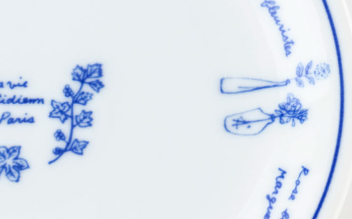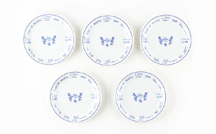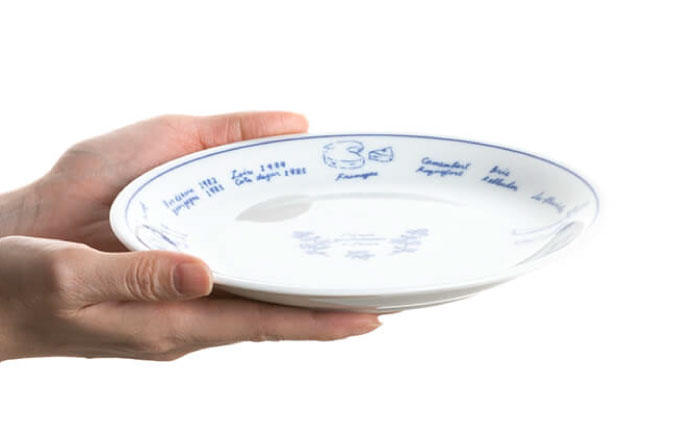 フランスのパリをイメージするパン、チーズ、花、ワインをかわいいイラストと文字でデザインし、見ているだけでも楽しい器です。