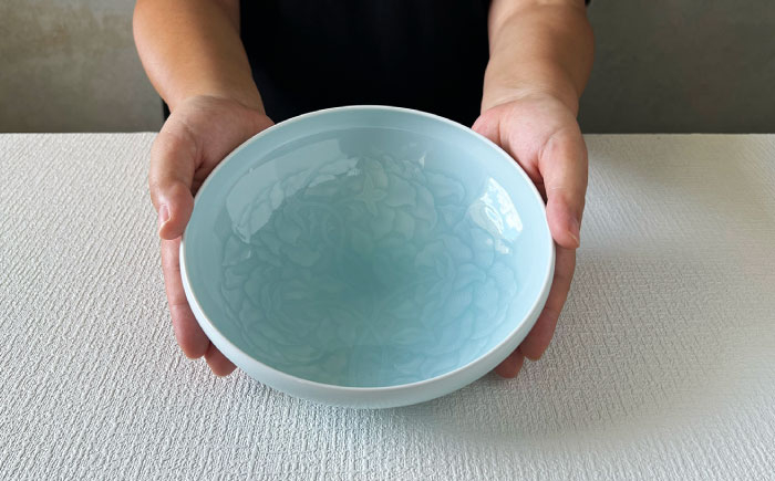 【美濃焼】青白磁輪花 花鳥兎文 鉢(木箱付)【快山製陶所】食…