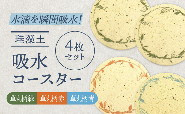 驚きの瞬間吸水!美濃焼珪藻土吸水コースター 【美濃焼】珪藻土 吸水コースター 4枚 セット(草丸柄)【立風製陶株式会社】 [MFE016]