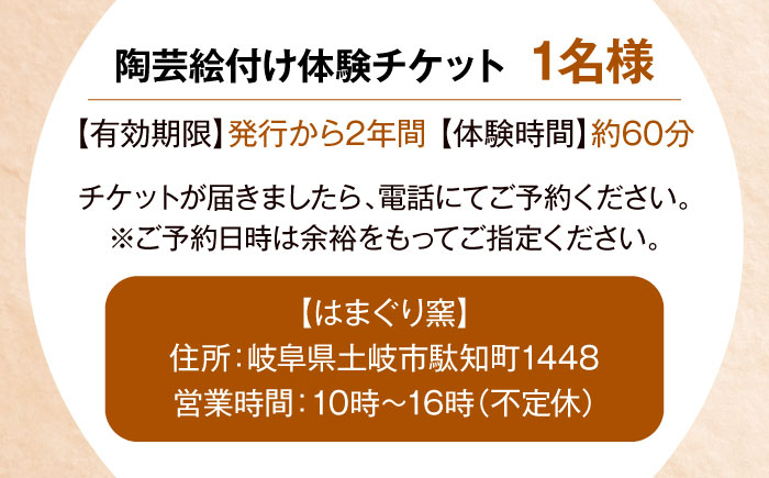 | 容量 | 陶芸&絵付け体験チケット 1名様分 有効期限:発行から2年間 【体験時間】 約60分 チケットが届きましたら、電話にてご予約ください。 ※ご予約日時は余裕をもってご指定ください。 |