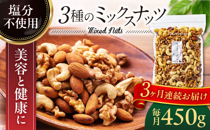 毎月届く!塩分不使用、3種のミックスナッツ! 【3回定期便】<塩分不使用>ミックスナッツ 中パック 450g【多々楽達屋】tataratiya 無塩 おつまみ おやつ [MAD053]