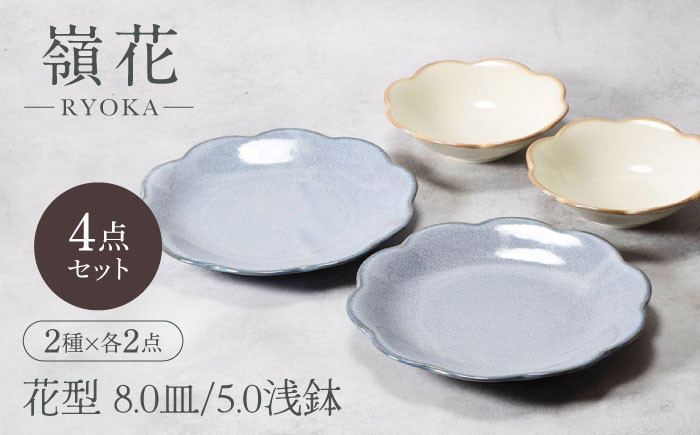 食卓を華やかに演出する、お花の形の和食器セット 【美濃焼】嶺花 りょうか グレー ベージュ 花型 8.0皿 & 5.0浅鉢 2種×各2点 4点セット【カネ定製陶】 [MEI020]