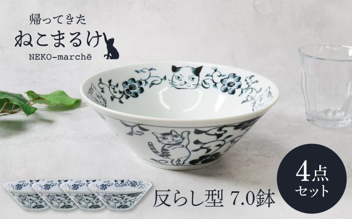 使う度にほっと癒される、猫の絵柄がかわいいラーメンどんぶり 【美濃焼】帰ってきた ねこまるけ kaettekita NEKO-marche 反らし型 7.0鉢 ヒゲボタン 4点セット【カネ定製陶】 [MEI047]
