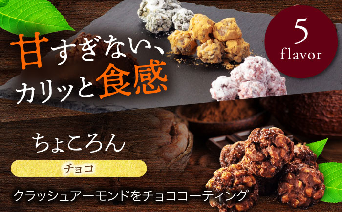 クラッシュアーモンドにチョコレートをコーティングし、バリエーション豊かな5種類の味に仕上げました。