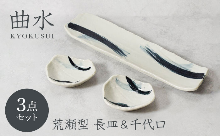 料理が映える、白と藍の上品な長皿&小皿セット 【美濃焼】曲水 きょくすい 荒瀬型 長皿 1点 & 千代口 2点 合計3点セット【カネ定製陶】 [MEI151]