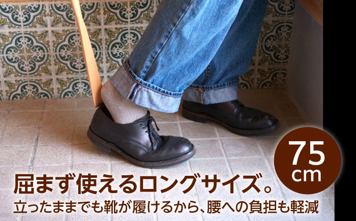 靴ベラの長さは約75cm。立ったままでも靴が履けるロングタイプだから、腰への負担も軽減。