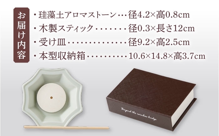 | 容量 | ・珪藻土アロマストーン×1:径4.2×高0.8cm(穴:径0.3cm) 珪藻土・粘土(美濃焼) ・受け皿×1:径9.2×高2.5cm 磁器(美濃焼) ・木製スティック×1:径0.3×長さ12cm ラタン 箱サイズ:10.6×14.8×3.7cm 【対応機器】 電子レンジ× / オーブン× / 食洗機× 【加工地】 土岐市 |
