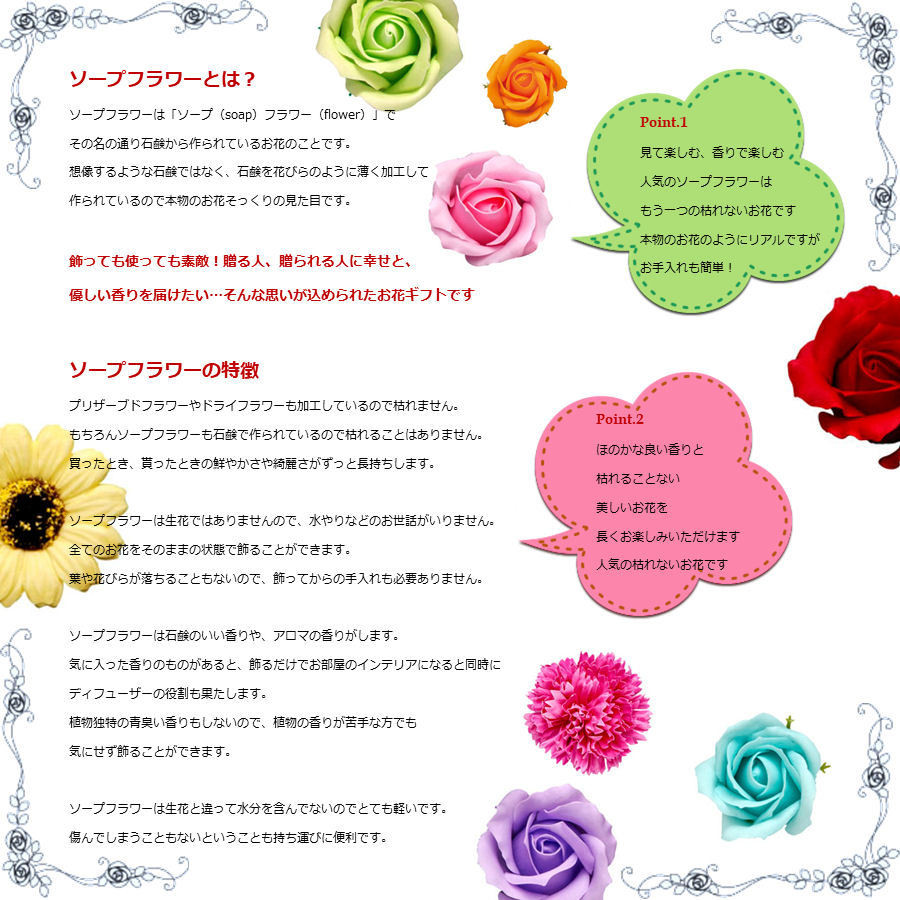 造花でもない、プリザでもない、もうひとつの枯れないお花です。薄い石けんを一枚一枚重ねて作られた花です。