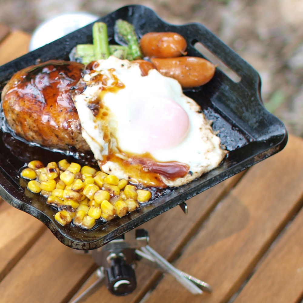 鉄板は、コンパクトサイズでハイキングや登山、ツーリングなどに持ち運べるサイズとなり、ミニリフター・収納ケースがセットになっております。ミニリフターは、取っ手部に引っ掛けて持ち運べ、表面の焦げ除去にもお使い頂けます。