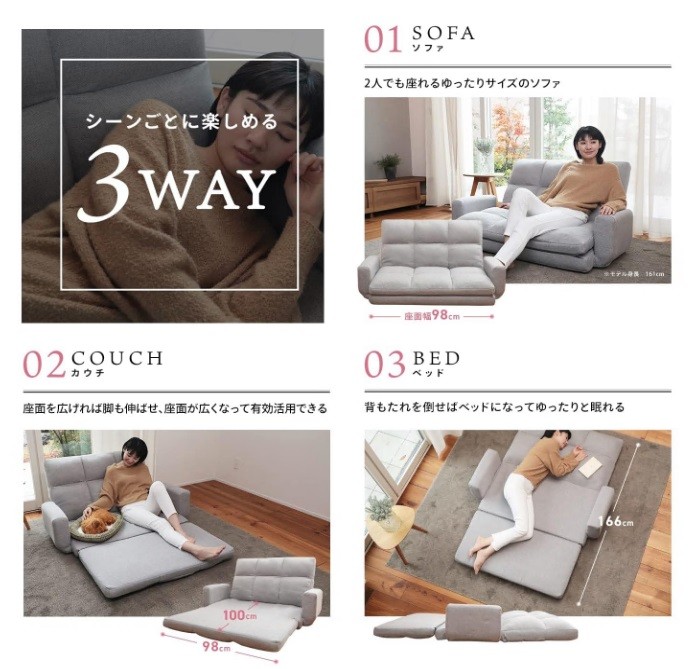 ソファにもベッドにもなる、便利でコスパのよいワイド座椅子。