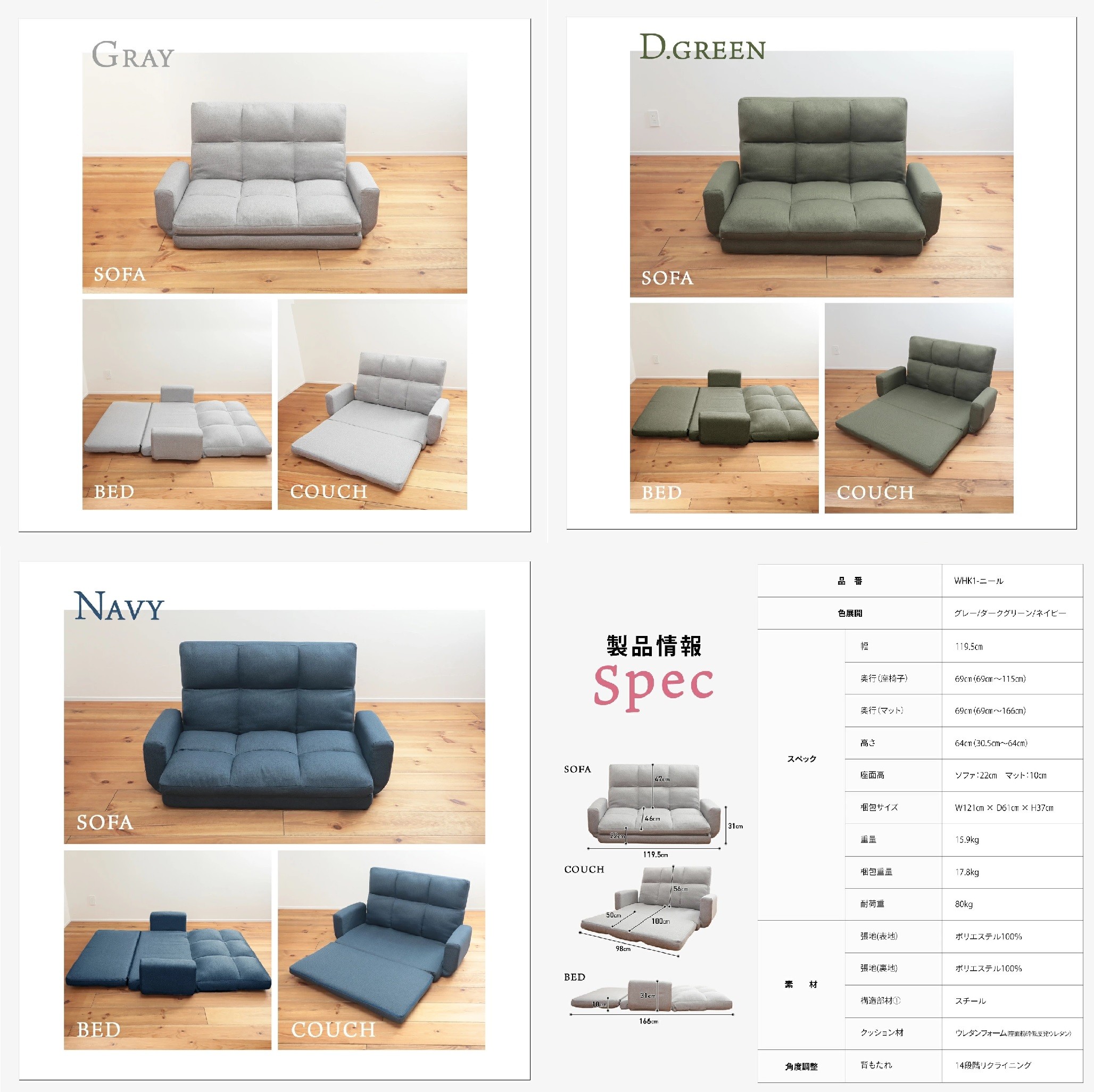 | 容量 | 【製品仕様】 幅119.5cm×奥行(座椅子)69(69~115)cm・奥行(マット)69(69~166)cm×高さ64(30.5~64)cm カラー:グレー/ダークグリーン/ネイビー |