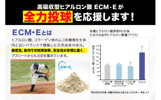 当社が長年研究してきた高吸収型ヒアルロン酸「ECM・E」が、試合・練習で蓄積される悩みに向け、スムーズで健康的なコンディションをサポートします。