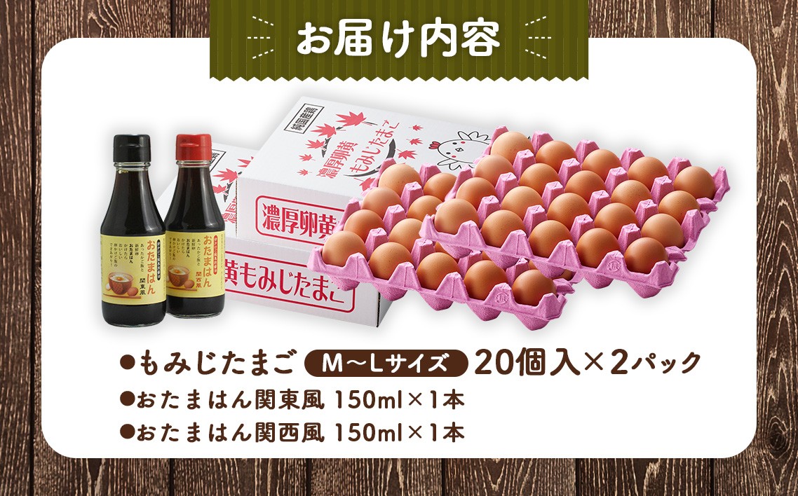 もみじたまご20個入り化粧箱を2箱で合計40個、おたまはん【関東風/関西風】を各1本セットにしてお届けします。