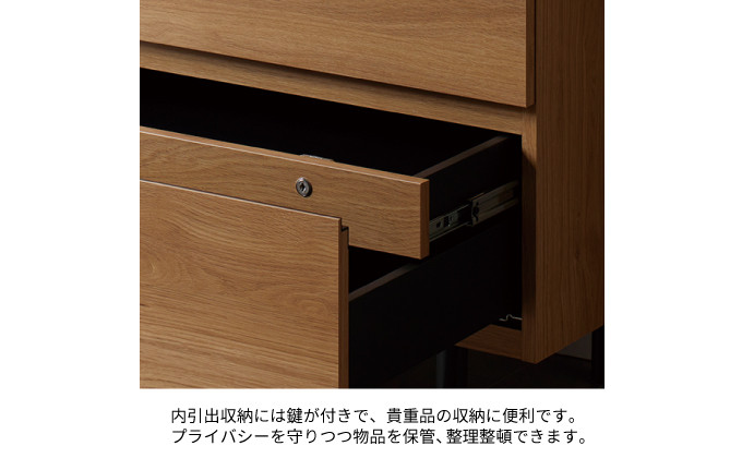 大型TV 向けに少し低めのTV ボードを中心として、幅や高さの違うチェストを組み合わせる事で、単調になりがちな壁面に躍動感が生まれます。AV 機器や小物類、貴重品に最適な収納機能も充実しています。世界的に有名なドイツヘティヒ社製レール採用。チェスト最下段の引出し内部には、貴重品の収納に便利な鍵付の内引出しがございます。底板表面は貴重品にやさしいベロア仕上げとなっています。