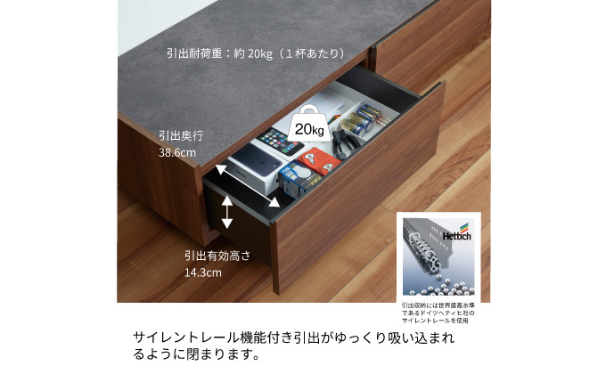 ・引出:吸い込まれるように閉まるソフトクロージング機能付き、フルスライド仕様。