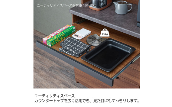 ・ミトンやラップ、レンジトレー等をさっと出し入れできるユーティリティスペースを設けることにより、カウンタートップが広く使用できます。