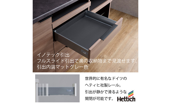 上台引戸には開閉両方向にソフトに作動するツインモーション機能を採用。さらに引出にもグレードの高いイノテック引出を採用しています。