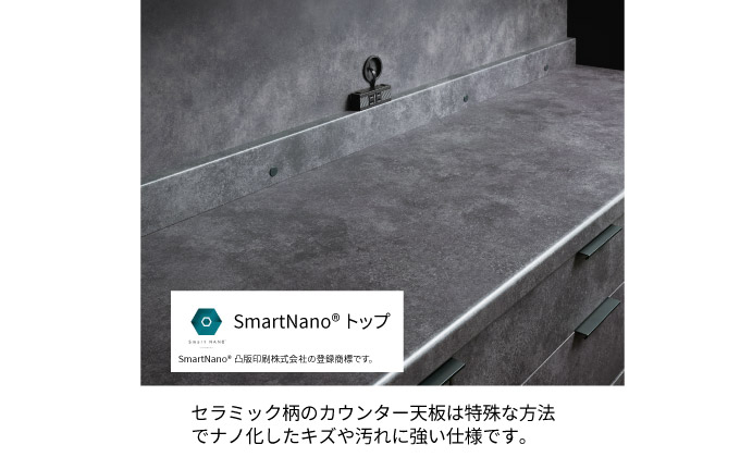 カウンター天板はナノレベルで強化されたコートが施されていますので、スリ傷に強い仕様になっています。