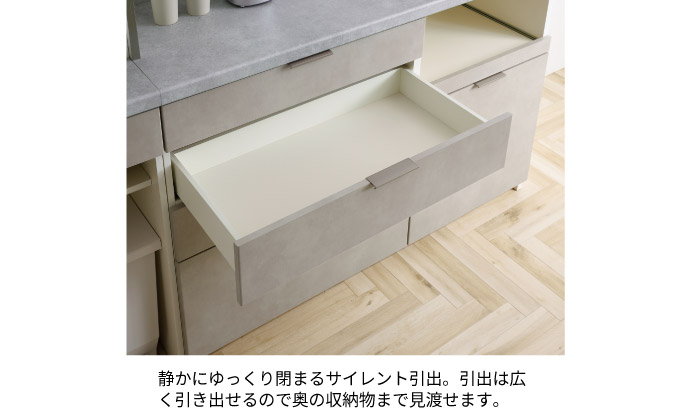 高さが異なる大中小の引出は収納の使い分けがしやすく、広く引き出せるので、奥の収納物まで見渡せます。