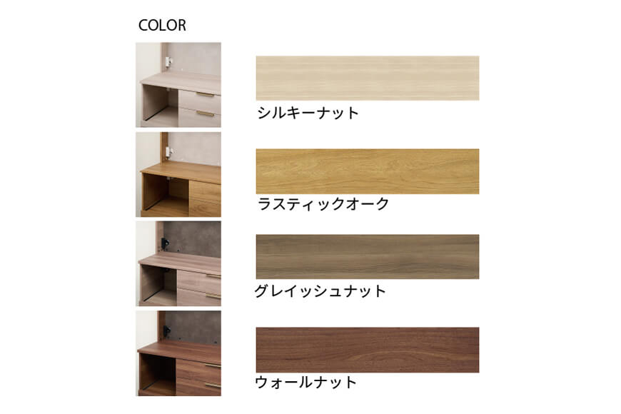 カラーはラスティックオーク、シルキーナット、グレイッショナット、ウォールナット、の4色からお選びいただけます。