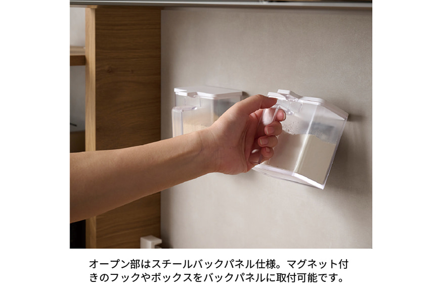 ゆとりのある高さ、55cmの上台オープン部はマグネットが取り付けられるスチールバックパネル仕様になっています。