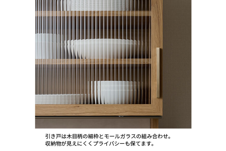 ナチュラルなデザインに馴染むモールガラス。適度な透過性で抜け感がありながら、収納しているものが見えにくくプライバシーも保たれます。