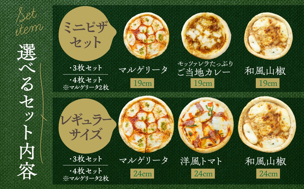 | 容量 | 【サイズと内容量が選べる】 《ミニピザ 直径19cm》 ・チーズたっぷりピザ直径19cm 計3枚 マルゲリータ 1枚・ご当地カレー味 1枚・和風山椒味 1枚 ・チーズたっぷりピザ直径19cm 計4枚 マルゲリータ 2枚・ご当地カレー味 1枚・和風山椒味 1枚 《レギュラーサイズ 直径24cm》 ・チーズたっぷりピザ直径24cm 計3枚 マルゲリータ 1枚・洋風トマト味 1枚・和風山椒味 1枚 ・チーズたっぷりピザ直径24cm 計4枚 マルゲリータ 2枚・洋風トマト味 1枚・和風山椒味 1枚 |