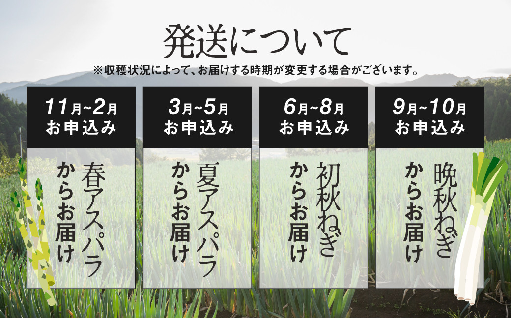 | 申込期日 | 通年 11月から2月のお申込み→春アスパラからお届け 3月から5月のお申込み→夏アスパラからお届け 6月から8月のお申込み→初秋ねぎからお届け 9月から10月のお申込み→晩秋ねぎからお届け |