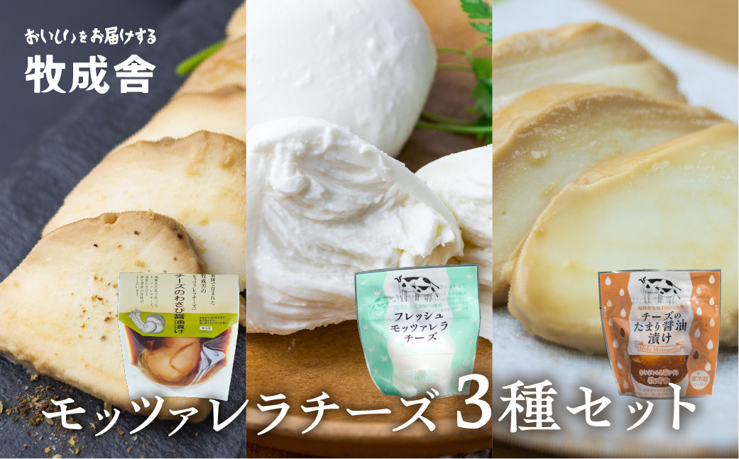 牧成舎の人気商品「フレッシュモッツァレラチーズ」と特製のだし溜り醤油に漬け込んだ「チーズのたまり醤油漬け」と、わさび醤油に漬け込んだ「チーズのわさび醤油漬け」のセットです。