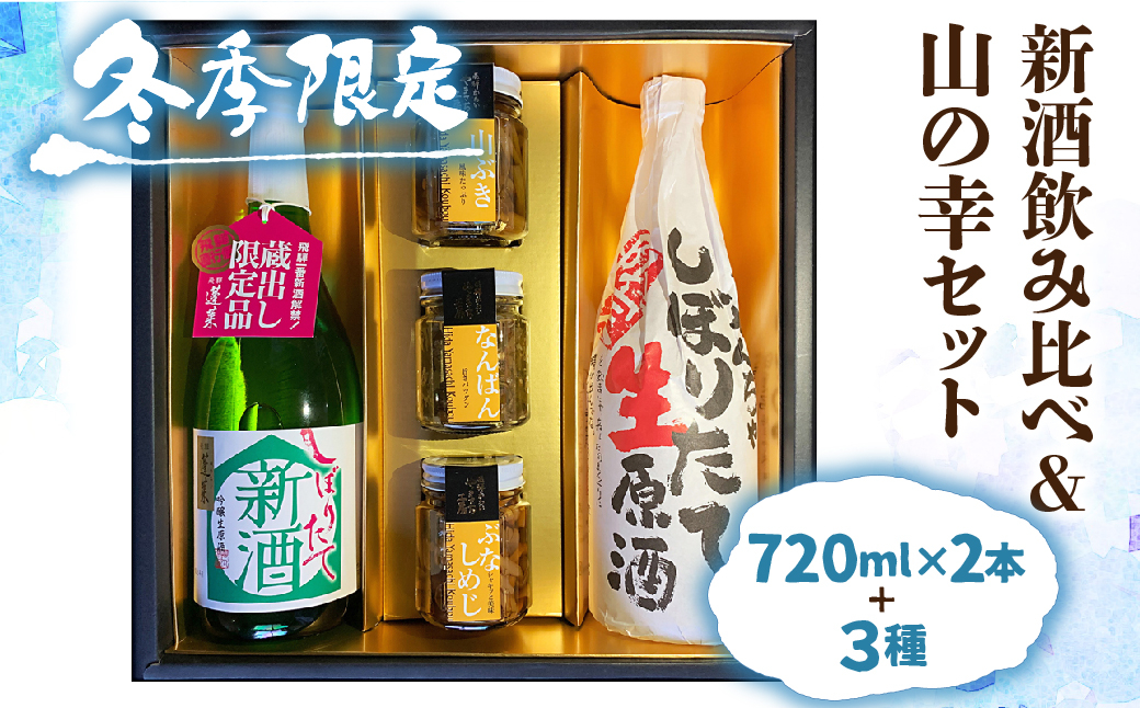 飛騨古川の2つの酒蔵「渡辺酒造店」「蒲酒造場」、各蔵しぼりたての新酒と、お酒にぴったりの山菜をセットにしました。