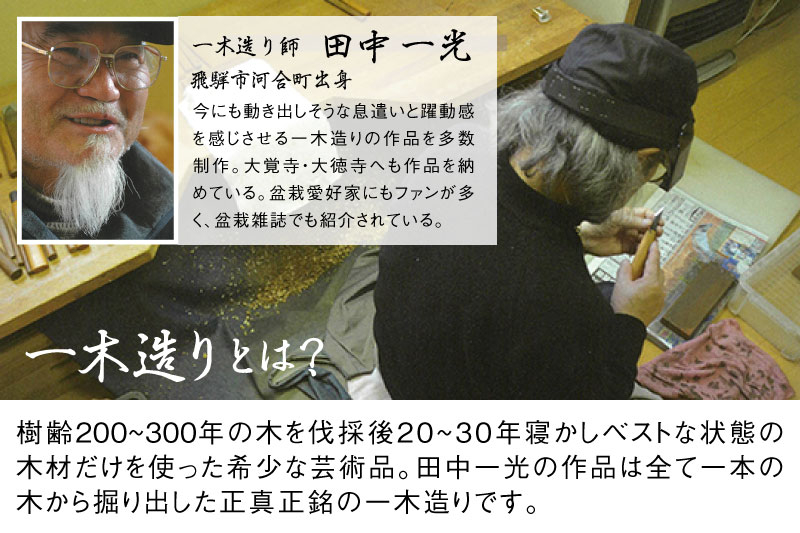 田中一光の作品は全て1本の木から掘り出した正真正銘の一木造りです。