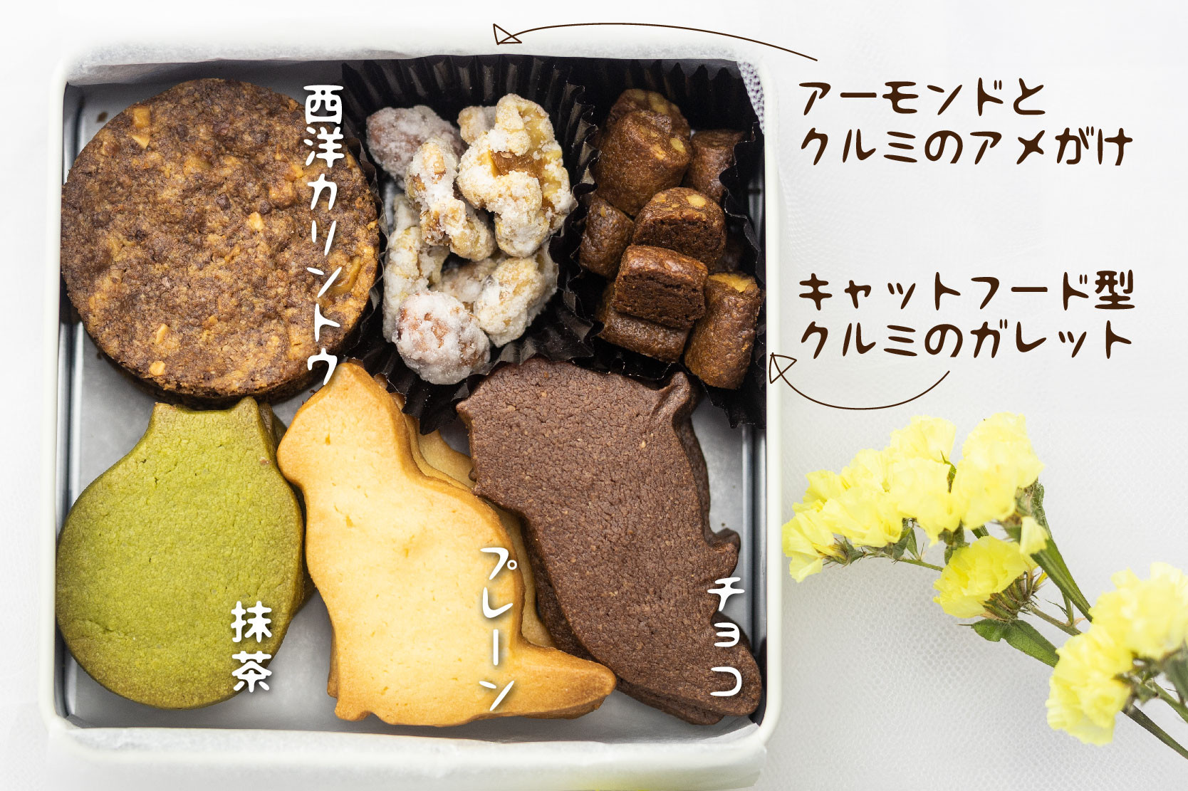 | 容量 | 3匹の猫型抜きクッキー(プレーン・チョコ・抹茶)×各3枚 西洋カリントウ×2枚 クルミのガレット(キャットフード型)×8~9粒 アーモンドホールとクルミのアメがけ×6~7粒 |