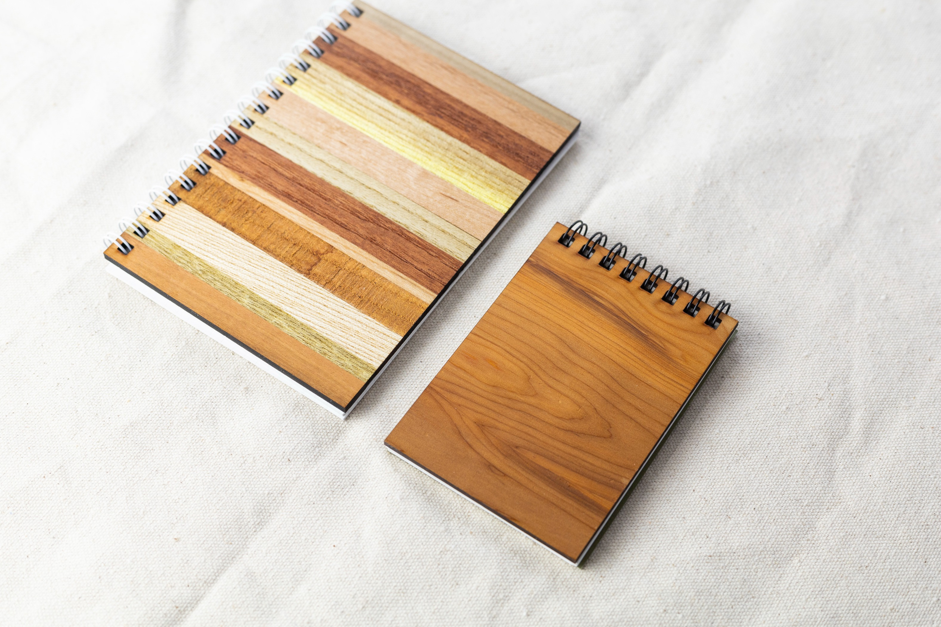 様々な木の組み合わせでつくられた寄木の板と、自然の風合いをそのまま感じていただける一枚板を表紙にしたノート。