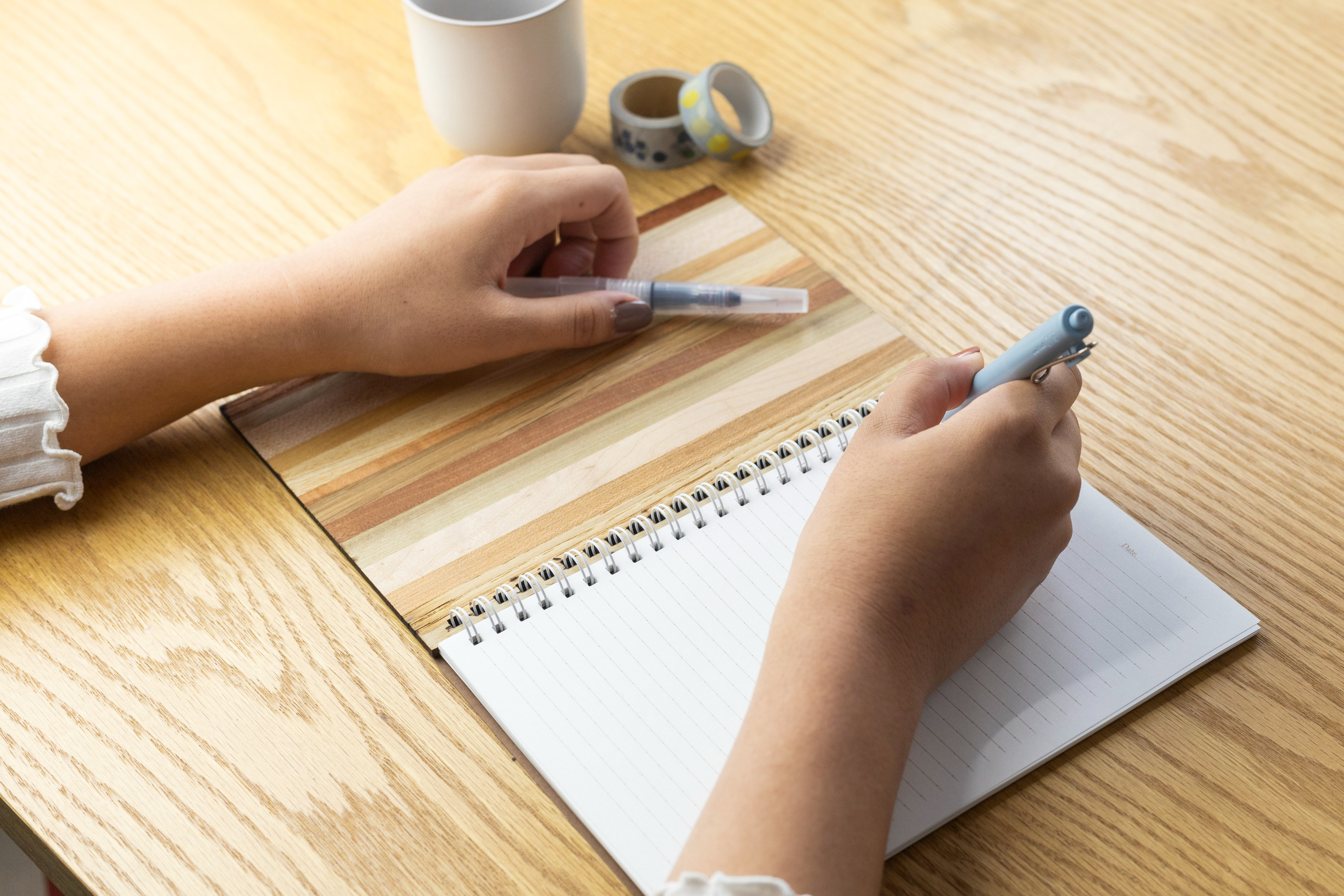 様々な木の組み合わせでつくられた寄木の板と、自然の風合いをそのまま感じていただける一枚板を表紙にしたノート。