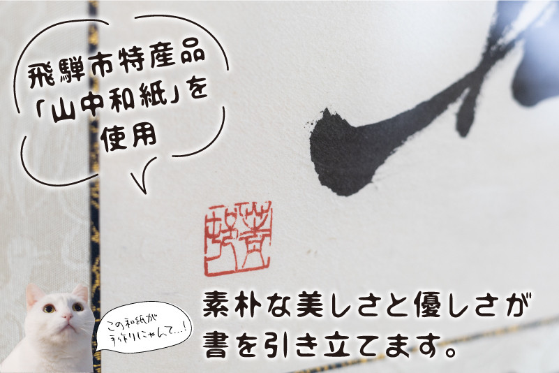 飛騨市の伝統工芸品「山中和紙」の素朴な美しさと優しさを感じる素材に、「猫舌」の一筆があしらわれた書をお届けいたします。