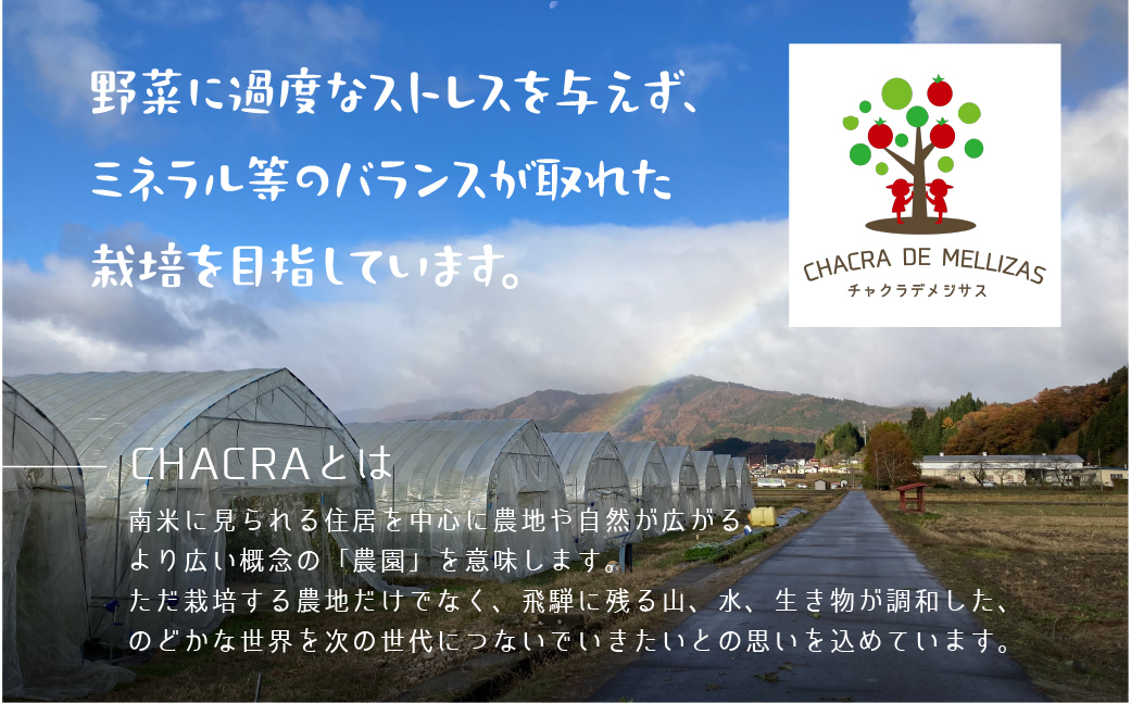 CHACRA DE MELLIZAS (チャクラデメジサス)は過度に作物にストレスをかける農法ではなく、ミネラル等のバランスが取れた栽培を志向しています。それが食物として求められる栄養バランスだけではなく、結果的に食べて美味しいということにもつながっていくと考えています。子供たちにたくさん食べてほしいからこそ、まじめな栽培を心がけています。
