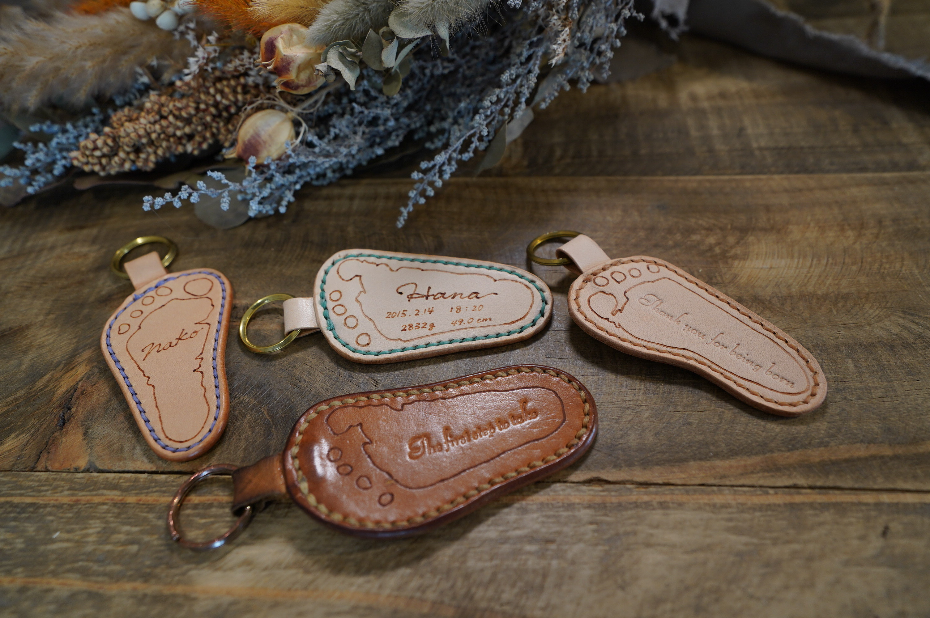 産まれた時の赤ちゃんの足型をそのままの大きさで革のキーホルダーにしました。 可愛いわが子と一緒に成長する、世界に一つだけのオリジナルキーホルダーです。