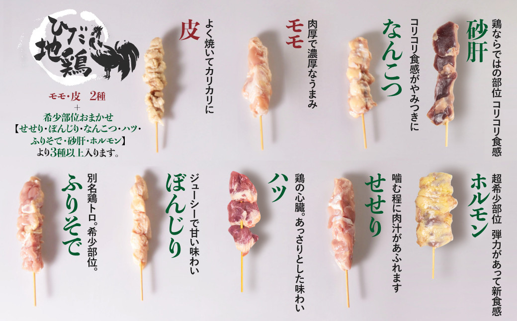 部位10種類は、どれも飛騨地鶏だからお楽しみいただける焼き鳥セットです。