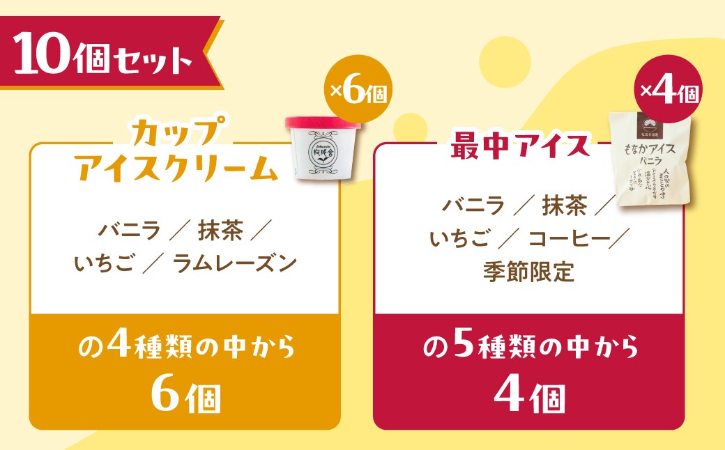 | 容量 | 《10点セットの場合》 ◆もなかアイス130ml×4個 (バニラ・イチゴ・抹茶・コーヒー・粒あん入り抹茶・季節限定から4個) ◆カップアイス3種×2個 (バニラ・抹茶・いちご・ラムレーズンから6個) 計10点 *味はおまかせです。 そのため訳ありとしてたっぷり楽しめるセットとなっています。 *食べられない味がある場合は備考欄にご記入ください。 |