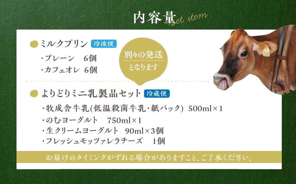 | 容量 | 【ミルクプリン】 プレーン味 70ml×6個 カフェオレ味 70ml×6個 【乳製品セット】 牧成舎牛乳(低温殺菌牛乳・紙パック) 500ml×1 のむヨーグルト 750ml×1 生クリームヨーグルト90ml×3個 フレッシュモッツァレラチーズ 1個 |
