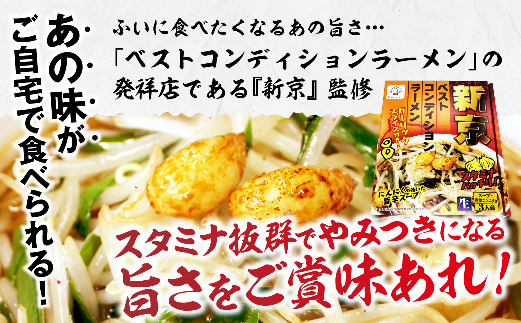 東海エリアのご当地ラーメン「ベストコンディションラーメン」の発祥店である『新京』監修。大ぶりなニンニクやニラ、モヤシがどっさり、一味の効いた旨辛スープでスタミナバッチリのラーメンは、食べて元気に笑顔になってもらえるよう新京初代店主が考案しました。