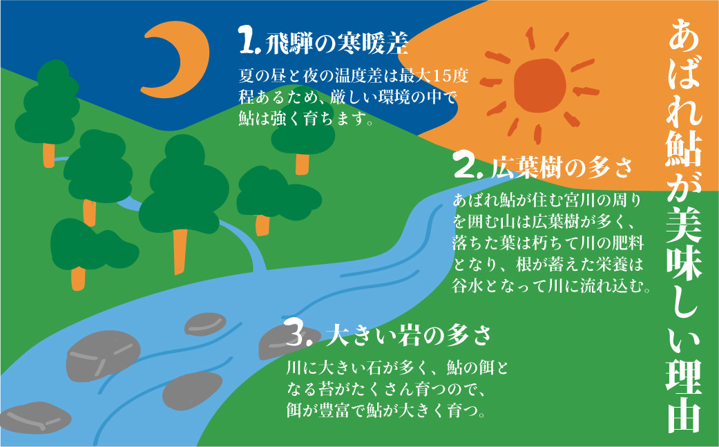 飛騨の森は広葉樹が多く、ミネラル豊富な飛騨の川で元気に育った鮎は身がしまり、程よい脂がのっています。
